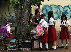 Dua gadis cantik ini setelah menaruh tasnya ke kelas keluar lagi tujuannya ke tukang makanan. Karena mereka melintas dekat sekali, seperti masih tercium bau minyak telon dan sabun mandi dari tubuh mereka. Tak tahu apakah mereka sudah sarapan atau belum namun jajan bagi anak sekolah sepertinya kewajiban ya?