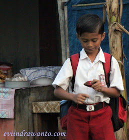 Nah mengambil tempat di bangku kayu sebuah warung, rasanya bahagia banget mengamati muka-muka lugu melintas bergantian. Ada yang datang bersama teman dan ada juga berjalan sendiri. Mungkin karena sekolah ini berada dalam perkampungan dan mereka juga tinggal tak jauh dari sekolah, tak terlihat ada antaran baik pakai mobil maupun motor.