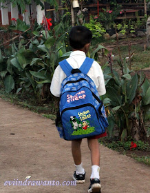Dia datang sendirian. Tertatih-tatih. Shaun of The Sheepnya tampak kebesaran dan tampak berat untuk tubuhnya yang mungil. Beban dari buku-buku berat ini tampaknya melanda sebagian besar anak sekolah saat ini. Anak saya juga begitu, tiap hari diganduli buku tebal. Kalah profesor lah eh!